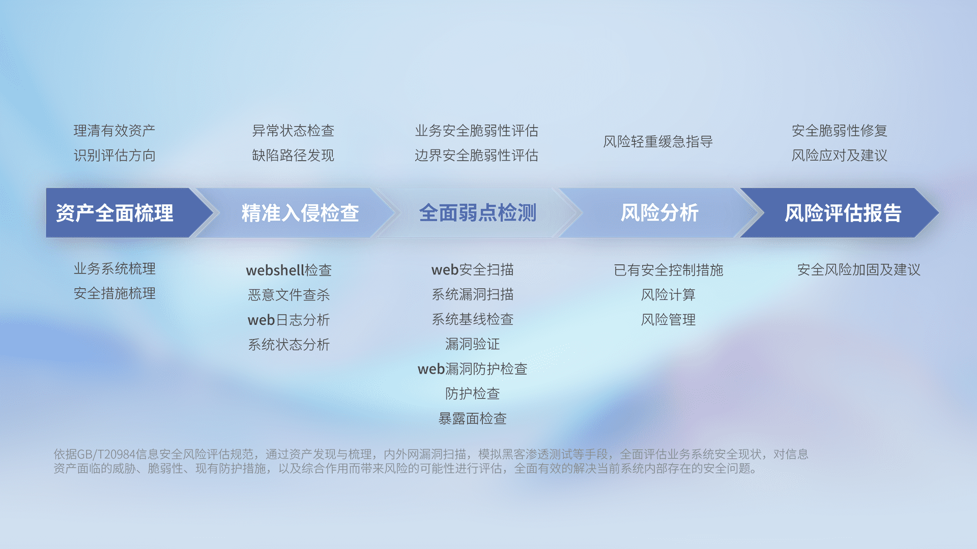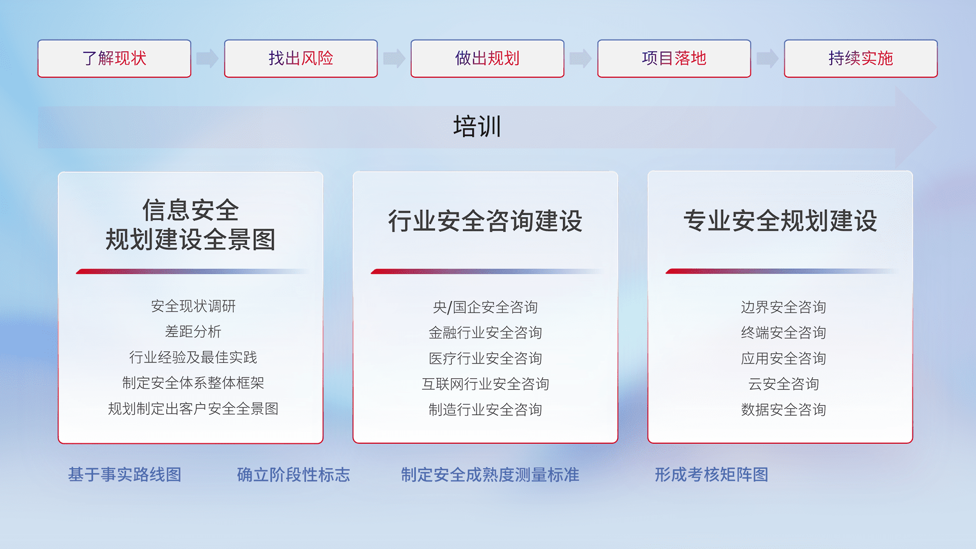 针对客户行业特性,,以专业的安全服务+多厂商联合解决方案提供专属的一站式安全管理服务,,,,帮助客户全面感知网络空间威胁,,,,基于识别、、检测、、、、分析、、防护、、监测、、响应的服务理论模型,,从方案咨询、、集成交付、、、评估验证、、、优化加固、、、运维运营,,,,致力于为客户提供完整的闭环管理式安全服务。。以实战经验为客户打造高抵御风险的安全体系,,帮助客户发现威胁、、、对抗威胁、、处置威胁,,,不断积累安全对抗能力,,,持续保障数字化安全。。。